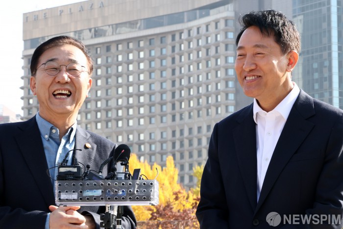 [서울=뉴스핌] 최지환 기자 = 김윤덕 국토교통부 장관(왼쪽)과 오세훈 서울시장이 13일 서울 중구 달개비컨퍼런스에서 오찬을 마치고 취재진과 질의응답을 하며 미소짓고 있다. 2025.11.13 choipix16@newspim.com