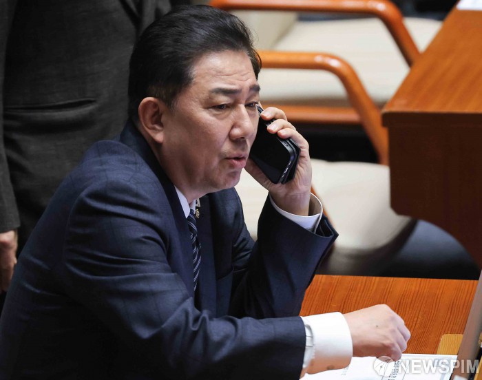 [서울=뉴스핌] 윤창빈 기자 = 김병기 더불어민주당 원내대표가 13일 서울 여의도 국회에서 열린 본회의에서 통화를 하고 있다. 2025.11.13 pangbin@newspim.com
