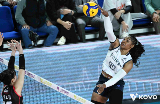 | [서울=뉴스핌] 도로공사의 아포짓 스파이커 모마가 12일에 열린 정관장과의 경기에서 공격을 시도하고 있다. [사진 = KOVO] 2025.11.12 wcn05002@newspim.com |