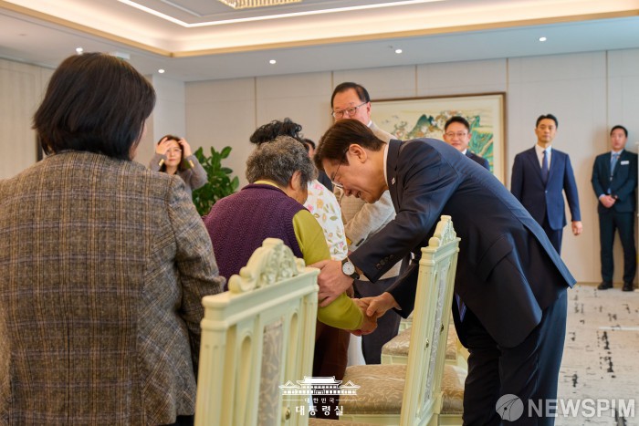 [서울=뉴스핌] 이재명 대통령이 13일 서울 용산 대통령실에서 열린 민주화실천가족운동협의회 초청 오찬 간담회에서 참석자들과 인사를 나누고 있다. [사진=대통령실] 2025.11.13 photo@newspim.com