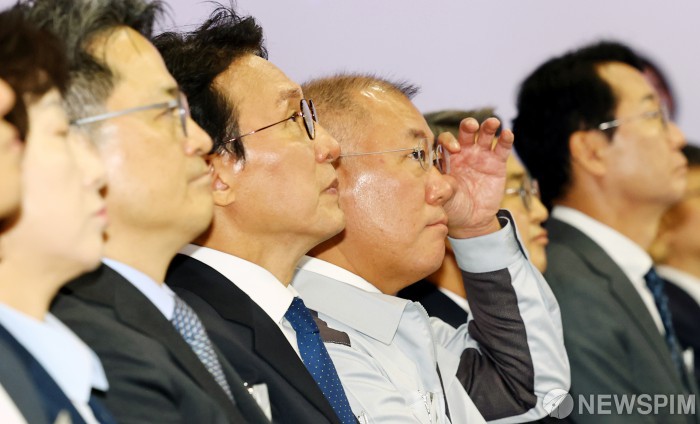 [화성=뉴스핌] 청사사진기자단 = 김민석 국무총리와 정의선 현대차그룹 회장이 14일 경기도 화성시 우정읍 기아오토랜드 화성에서 열린 기아 화성 EVO 플랜트 East 준공식 & West 기공식에 참석해 영상을 보고 있다. 2025.11.14 photo@newspim.com