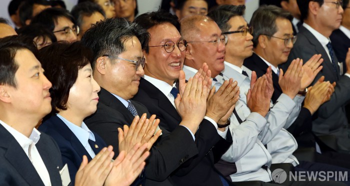 [화성=뉴스핌] 청사사진기자단 = 김민석 국무총리와 정의선 현대차그룹 회장이 14일 경기도 화성시 우정읍 기아오토랜드 화성에서 열린 기아 화성 EVO 플랜트 East 준공식 & West 기공식에서 박수치고 있다. 2025.11.14 photo@newspim.com