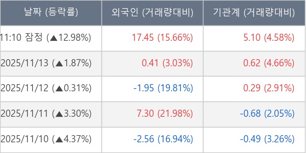 [서울=뉴스핌] 로보뉴스 = 14일 11시 30분 현재 상신이디피(091580)는 외국인과 기관이 각각 17.45 만 주, 5.10 만 주 순매수(잠정) 하면서 전일 대비 12.98% (현재가 14,800원) 상승하고 있다.