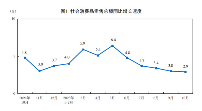 10월 사회 소비품 소매 총액은 4조 6291억 위안으로 전년 대비 2.9% 증가했다. 지난 5월 6.4%를 기록했던 사회 소비품 소매 총액 증가율은 6월 4.8%로 둔화된 데 이어 7월에는 3.7%, 8월에는 3.4%, 9월에는 3.0%로 지속 낮아졌다. 10월 상품 판매액은 2.8% 증가했으며, 외식 소비액은 3.8% 증가하는 데 그쳤다.