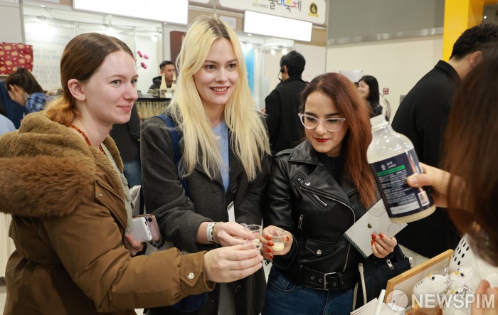 [서울=뉴스핌] 김학선 기자 = 14일 서울 양재동 aT센터에서 열린 '2025 대한민국 우리술 대축제'를 찾은 외국인들이 술을 시음하고 있다. 올해로 15회째를 맞는 우리술 대축제는 매년 2만여 명이 찾는 대표적인 우리술 행사다. 2025.11.14 yooksa@newspim.com