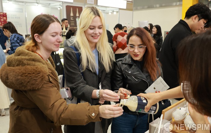 [서울=뉴스핌] 김학선 기자 = 14일 서울 양재동 aT센터에서 열린 '2025 대한민국 우리술 대축제'를 찾은 외국인들이 술을 시음하고 있다. 올해로 15회째를 맞는 우리술 대축제는 매년 2만여 명이 찾는 대표적인 우리술 행사다. 2025.11.14 yooksa@newspim.com