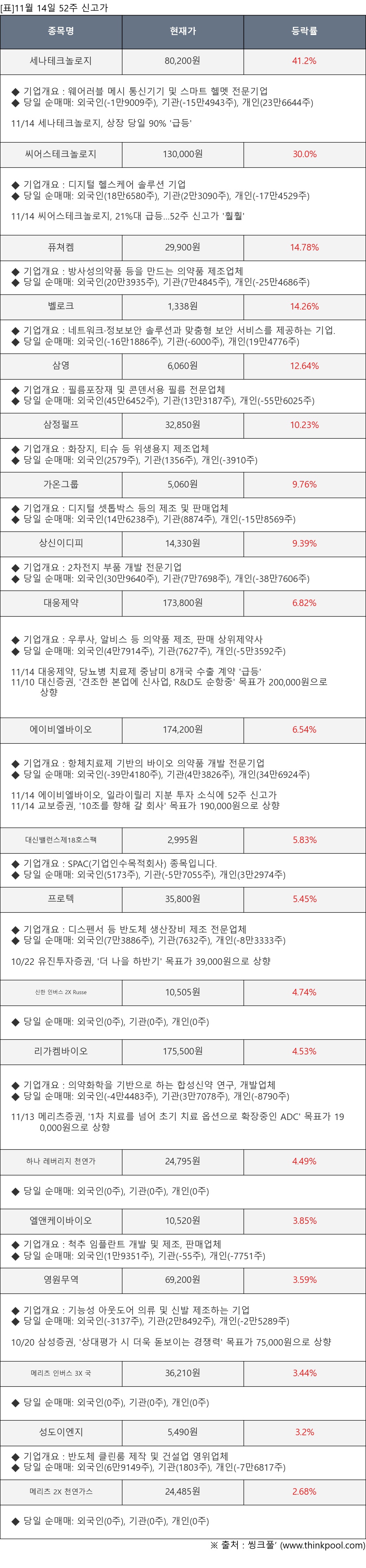 [서울=뉴스핌] 로보뉴스 = 11월 14일, 인공지능 투자비서 ‘AI라씨로’가 세나테크놀로지(061090), 씨어스테크놀로지(458870) 등 52주 신고가가 발생한 종목들에 대한 최근 동향을 분석했다.