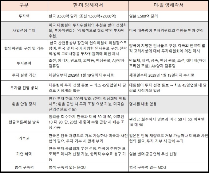 | '한미 전략적 대미 투자 양해각서'와 '미일 전략적 대미 투자 양해각서'의 비교 [출처 =각국정부] |