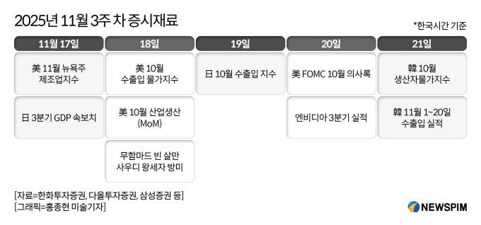 한편 이번 주에는 미국 11월 뉴욕주 제조업지수(17일), 일본 3분기 GDP 속보치(17일), 미국 10월 수출입 물가지수·산업생산(18일), 일본 10월 수출입 지수(19일) 등이 예정돼 있다. 21일에는 한국의 10월 생산자물가지수(PPI)와 11월 1~20일 수출입 실적이 발표될 예정으로, 수출 회복세 지속 여부가 관건이다.