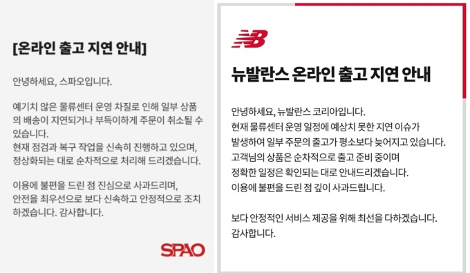 스파오·뉴발란스코리아 공지문 내고 "배송 지연" 안내