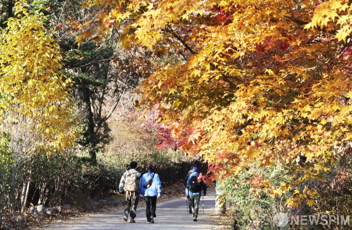 [서울=뉴스핌] 양윤모 기자 = 휴일인 16일 서울 북한산국립공원을 찾은 시민들이 아쉬운 가을의 끝자락에 황금빛으로 피어난 단풍을 즐기고 있다. 2025.11.16 yym58@newspim.com