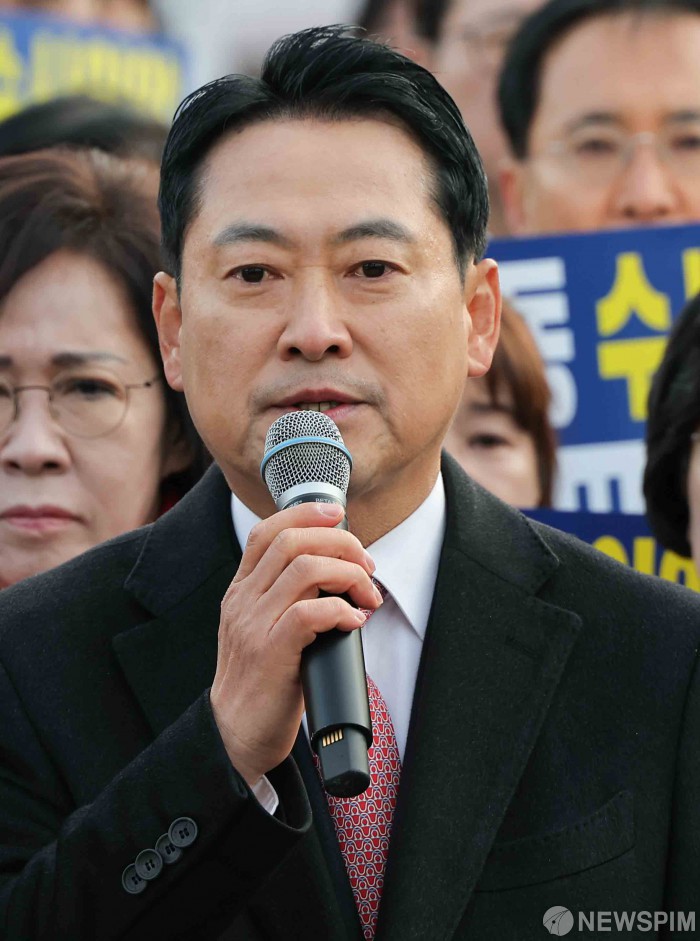 [서울=뉴스핌] 윤창빈 기자 = 장동혁 국민의힘 대표가 17일 서울 용산구 전쟁기념관 앞에서 열린 대장동 항소포기 외압 진상규명을 위한 국정조사 촉구 기자회견에서 규탄사를 하고 있다. 2025.11.17 pangbin@newspim.com