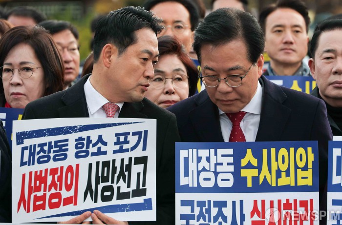 [서울=뉴스핌] 윤창빈 기자 = 장동혁 국민의힘 대표, 송언석 원내대표가 17일 서울 용산구 전쟁기념관 앞에서 열린 대장동 항소포기 외압 진상규명을 위한 국정조사 촉구 기자회견에서 대화를 나누고 있다. 2025.11.17 pangbin@newspim.com