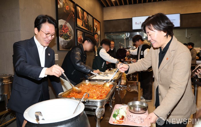 [서울=뉴스핌] 청사사진기자단 = 김민석 국무총리와 송미령 농림축산식품부 장관이 17일 오전 서울 종로구 성균관대학교 은행골식당에서 학생들과 함께 '천원의 아침밥' 식사 배식을 하고 있다. 2025.11.17 photo@newspim.com