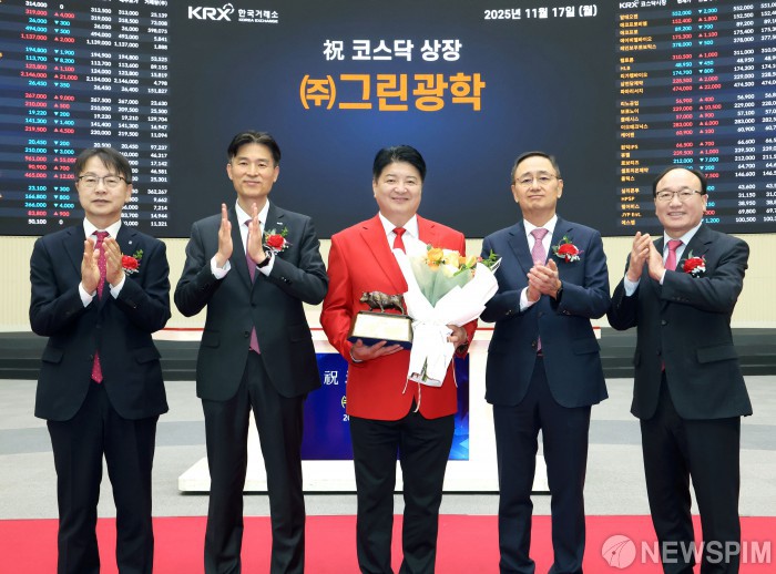 [서울=뉴스핌] 조현일 그린광학 대표이사가 17일 서울 영등포구 한국거래소에서 열린 그린광학 코스닥시장 상장기념식에서 상장기념패를 들고 기념촬영을 하고 있다. 왼쪽부터 김대영 한국IR협의회 부회장, 민경욱 한국거래소 코스닥시장본부장, 조 대표이사, 금정호 신영증권 사장, 강왕락 코스닥협회 부회장. [사진=한국거래소] 2025.11.17 photo@newspim.com
