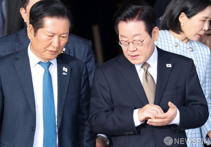 [성남=뉴스핌] 최지환 기자 = 주요 20개국(G20) 정상회의 참석차 중동·아프리카 순방길에 오른 이재명 대통령이 17일 오전 경기 성남 서울공항에서 공군 1호기로 이동하며 정청래 더불어민주당 대표와 대화를 나누고 있다. 2025.11.17 choipix16@newspim.com