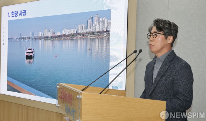 [서울=뉴스핌] 양윤모 기자 = 김선직 (주)한강버스 대표가 17일 오전 서울시청에서 한강버스 멈춤사고 관련 브리핑을 하고 있다. 15일 저녁 잠실선착장서 100m 떨어진 지점에서 승객 82명이 탑승한 102호 한강버스가 강바닥에 걸려 멈추는 사고가 발생해 잠실~압구정 구간 운행이 중단된 상태이며 19일 19시에 이동할 예정이다. 김민석 국무총리는 16일 사고 원인 규명과 안전 대책 점검을 지시했으며,오세훈 서울시장은 “승객 여러분께 불안과 불편을 끼쳐드려 송구하다”고 고개를 숙였다. 2025.11.17 yym58@newspim.com