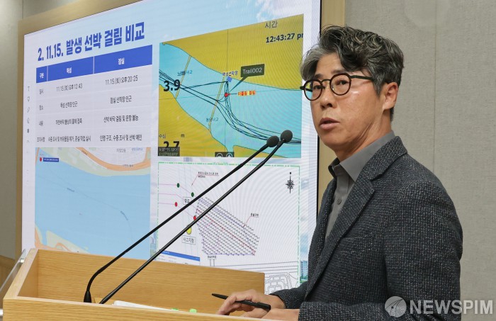 [서울=뉴스핌] 양윤모 기자 = 김선직 (주)한강버스 대표가 17일 오전 서울시청에서 한강버스 멈춤사고 관련 브리핑을 하고 있다. 15일 저녁 잠실선착장서 100m 떨어진 지점에서 승객 82명이 탑승한 102호 한강버스가 강바닥에 걸려 멈추는 사고가 발생해 잠실~압구정 구간 운행이 중단된 상태이며 19일 19시에 이동할 예정이다. 김민석 국무총리는 16일 사고 원인 규명과 안전 대책 점검을 지시했으며,오세훈 서울시장은 “승객 여러분께 불안과 불편을 끼쳐드려 송구하다”고 고개를 숙였다. 2025.11.17 yym58@newspim.com