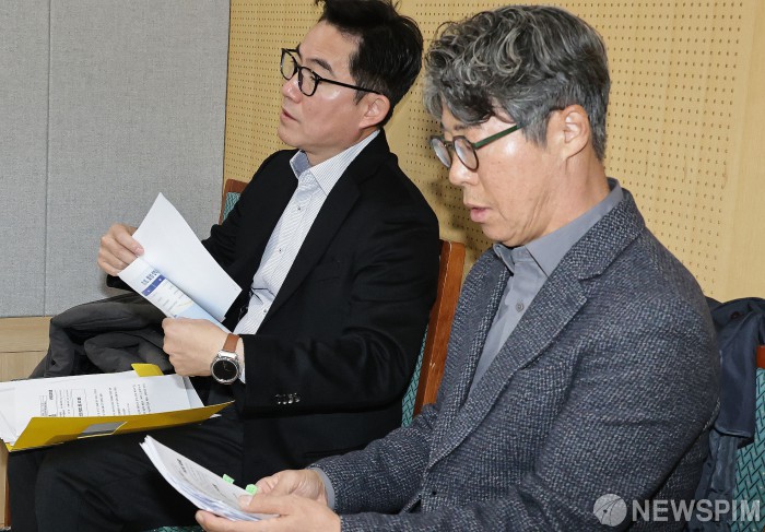 [서울=뉴스핌] 양윤모 기자 = 김선직 (주)한강버스 대표(우측)가 17일 오전 서울시청에서 한강버스 멈춤사고 관련 브리핑을 하기전 자료를 확인하고 있다. 15일 저녁 잠실선착장서 100m 떨어진 지점에서 승객 82명이 탑승한 102호 한강버스가 강바닥에 걸려 멈추는 사고가 발생해 잠실~압구정 구간 운행이 중단된 상태이며 19일 19시에 이동할 예정이다. 김민석 국무총리는 16일 사고 원인 규명과 안전 대책 점검을 지시했으며,오세훈 서울시장은 “승객 여러분께 불안과 불편을 끼쳐드려 송구하다”고 고개를 숙였다. 2025.11.17 yym58@newspim.com