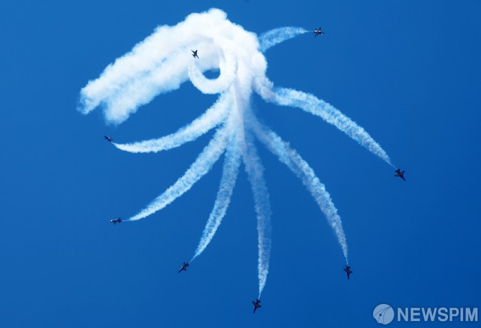 | [서울=뉴스핌] 이길동 기자 = 제 1회 방위산업의 날(7월 8일) 제정을 기념해 시민 참여 페스티벌이 열린 12일 서울 서초구 반포한강공원 일대에서 공군 특수비행팀 블랙이글스가 에어쇼를 펼치고 있 다.2025.07.12gdlee@newspim.com |