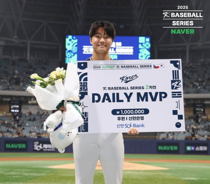 | [서울=뉴스핌] 한화의 정우주가 지난 9일 체코와의 평가전 2차전에서 불펜 투수로 투입된 후 데일리 MVP에 선정됐다. [사진 = KBO SNS] 2025.11.09 wcn05002@newspim.com |
