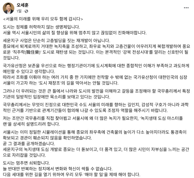 | [서울=뉴스핌] 이지은 기자 = 오세훈 서울시장이 세운4구역 재개발에 이야기하며 국가유산청을 언급한 글. [사진=오세훈 페이스북] 2025.11.17 alice09@newspim.com |