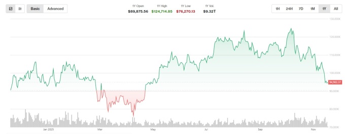 한국시간 기준으로 17일 오전 6시경 비트코인 가격은 9만 3,000달러 선까지 밀려, 작년 말 미국 대통령선거에서 도널드 트럼프가 승리한 직후 금융시장이 랠리를 펼쳤던 당시의 연말 종가 밑으로 내려갔다.
