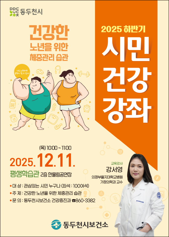 [동두천=뉴스핌]신선호 기자=동두천시는 다음달 11일 평생학습관 한울림 공연장에서 '건강한 노년을 위한 체중관리 습관'을 주제로 시민건강강좌를 운영할 예정이라고 17일 밝혔다.
