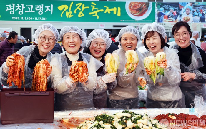 [서울=뉴스핌] 양윤모 기자 = 축제 마지막날인 17일 강원도 평창군 진부면민체육공원에서 열리고 있는 '평창고랭지김장축제'를 찾은 여고 동창생들이 즐거운 표정으로 김장을 담그고 있다. 평창고랭지김장 축제위원회에 따르면 올해로 8회째를 맞는 이번 축제는 6만명의 방문객과 총 30억 원의 매출을 올림으로써 지역경제 활성화에 큰 몫을 담당했다. [사진=평창군청] 2025.11.17 yym58@newspim.com