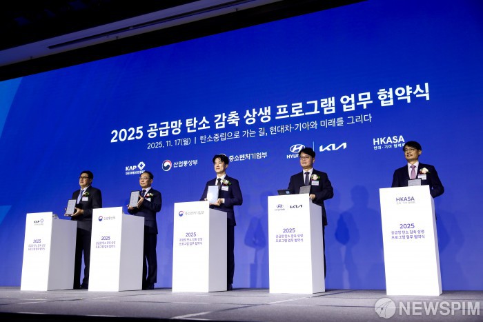 [서울=뉴스핌] 17일 서울 종로구 JW 메리어트 동대문에서 열린 2025 공급망 탄소 감축 상생 프로그램 업무 협약식에서 참석자들이 기념촬영하고 있다. 왼쪽부터 안정구 자동차부품산업진흥재단 이사장, 박동일 산업통상부 산업정책실장, 노용석 중소벤처기업부 제1차관, 정준철 현대차·기아 부사장, 문성준 현대차·기아 협력회 회장. [사진=중소벤처기업부] 2025.11.17 photo@newspim.com