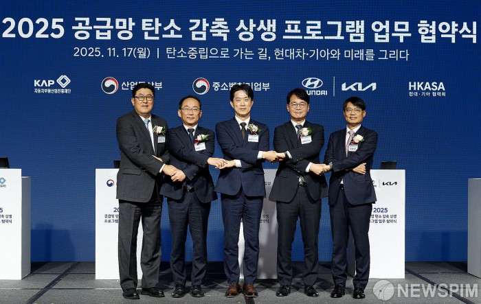 [서울=뉴스핌] 17일 서울 종로구 JW 메리어트 동대문에서 열린 2025 공급망 탄소 감축 상생 프로그램 업무 협약식에서 참석자들이 기념촬영을 하고 있다. 왼쪽부터 안정구 자동차부품산업진흥재단 이사장, 박동일 산업통상부 산업정책실장, 노용석 중소벤처기업부 제1차관, 정준철 현대차·기아 부사장, 문성준 현대차·기아 협력회 회장. [사진=산업통상부] 2025.11.17 photo@newspim.com