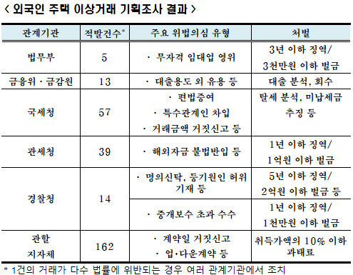 아울러 추진단은 외국인 위법행위에 대한 법적제재 조치 상향을 관계부처끼리 논의하고 자금조달계획서에 해외자금 조달내역도 포함하는 한편 탈세 혐의 및 의심거래에 대해서도 본국으로 적극 통보하기로 했다.