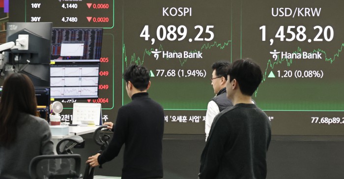 | [서울=뉴스핌] 양윤모 기자 = 17일 오후 코스피가 전장 종가보다 77.68 포인트(1.94%) 상승하며 4089.25로, 코스닥은 4.77 포인트(0.53%) 상승한 902.67로 장을 마감한 가운데, 서울 중구 하나은행 딜링룸에서 직원들이 업무를 보고 있다. 서울외환시장에서 달러/원 환율은 전장 대비 1.20원 상승한 1458.20원에 주간거래를 마감했다. 2025.11.17 yym58@newspim.com |