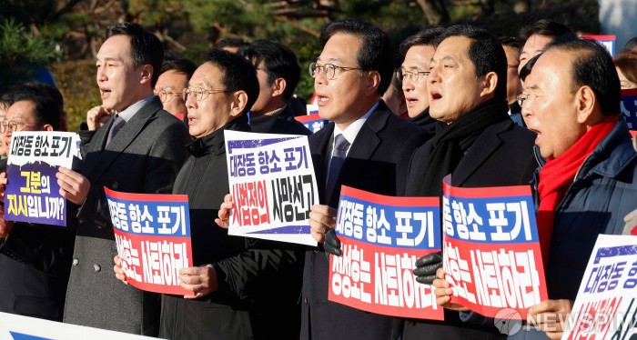 [과천=뉴스핌] 류기찬 기자 = 송언석 국민의힘 원내대표 등 의원들이 18일 오전 경기 과천시 정부과천청사 앞에서 열린 '대장동 항소포기 외압 정성호 법무부장관 사퇴촉구 기자회견'에서 구호를 외치고 있다. 2025.11.18 ryuchan0925@newspim.com