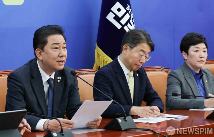 [서울=뉴스핌] 윤창빈 기자 = 김병기 더불어민주당 원내대표가 18일 오전 서울 여의도 국회에서 열린 원내대책회의에서 모두발언을 하고 있다. 2025.11.18 pangbin@newspim.com