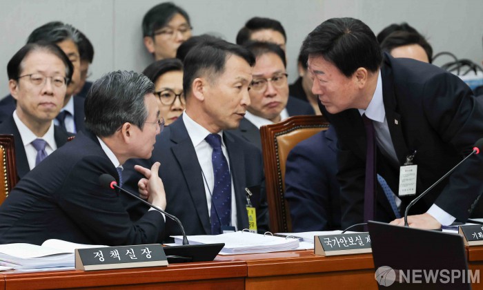 [서울=뉴스핌] 윤창빈 기자 = 김용범 정책실장이 18일 서울 여의도 국회에서 열린 운영위원회 전체회의에서 관계자와 대화를 나누고 있다. 2025.11.18 pangbin@newspim.com