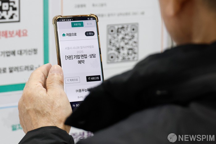 [서울=뉴스핌] 류기찬 기자 = 18일 오전 서울 강남구 세텍 서울무역전시장에서 열린 ‘서울 시니어 일자리 박람회 2025'를 찾은 구직자들이 채용게시판을 살펴보고 있다. 2025.11.18 ryuchan0925@newspim.com