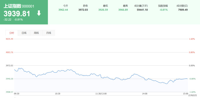 이날 상하이종합지수는 0.81% 하락한 3939.81, 선전성분지수는 0.92% 하락한 13080.49, 촹예반지수는 1.16% 하락한 3069.22로 각각 장을 마감했다.