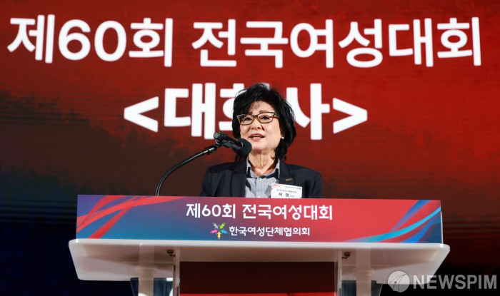 [서울=뉴스핌] 김학선 기자 = 허명 한국여성단체협의회장이 18일 서울 강남구 코엑스에서 '양성평등의 시대, 여성이 함께'라는 주제로 열린 제60회 전국여성대회에서 대회사를 하고 있다. 2025.11.18 yooksa@newspim.com