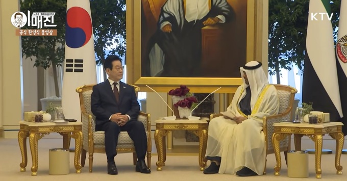 | 아랍에미리트(UAE)를 국빈 방문 중인 이재명 대통령이 18일(현지시간) 아부다비 대통령궁에서 무함마드 빈 자이드 알 나흐얀 UAE 대통령과 한-UAE 확대회담을 하고 있다. [사진=KTV] |