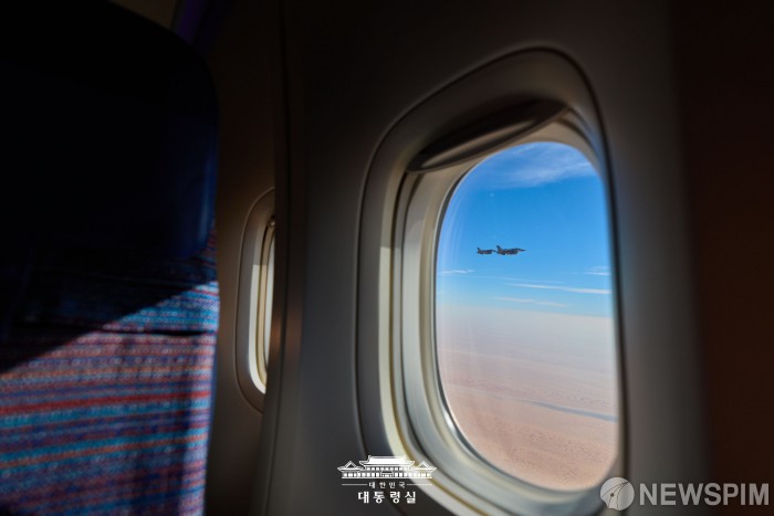 [서울=뉴스핌] 17일(현지시간) 이재명 대통령이 탑승한 공군 1호기가 아랍에미리트(UAE) 상공에서 UAE 공군 전투기의 호위를 받고 있다. [사진=대통령실] 2025.11.18 photo@newspim.com