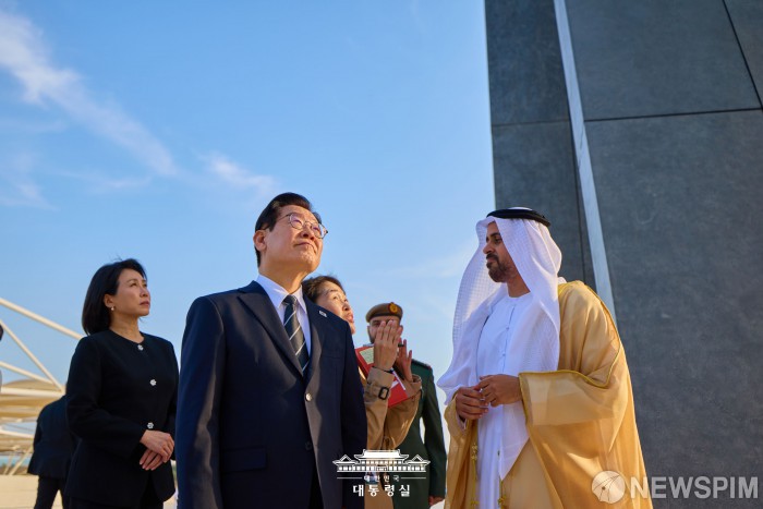 [서울=뉴스핌] 이재명 대통령이 17일(현지시간) UAE 현충원인 '와하트 알 카리마'에서 추모공간을 둘러보고 있다. [사진=대통령실] 2025.11.18 photo@newspim.com