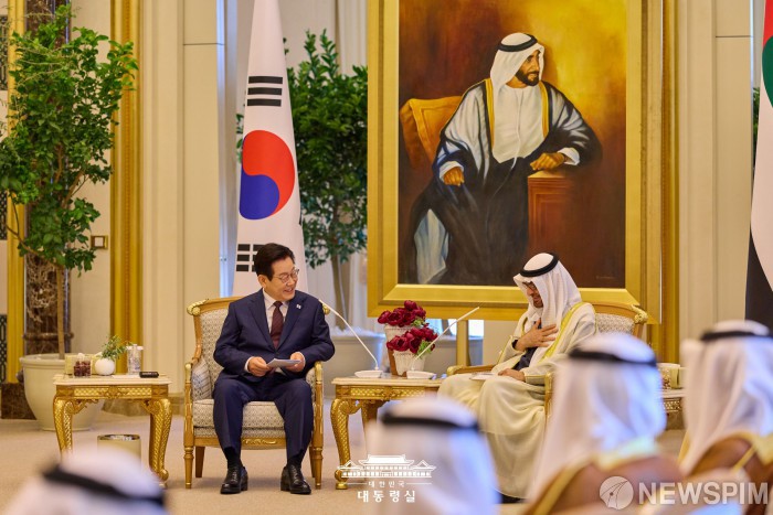 [서울=뉴스핌] 박성준 기자 = 이재명 대통령과 무함마드 빈 자이드 알 나흐얀 UAE 대통령은 18일(현지시간) 아부다비에서 정상회담을 열고 '한국·UAE 100년 동행을 위한 새로운 도약' 공동선언문을 채택했다.