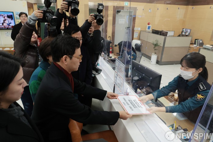 [서울=뉴스핌]박정훈 의원등 국민의힘 서울지역·국회 행정안전위원회 소속 의원들이 19일 오전 서울 종로구 서울지방경찰청 민원실에 김민석 국무총리 공직선거법 및 국가공무원법 위반 혐의 고발장을 제출하고 있다. 2025.11.19 gdlee@newspim.com