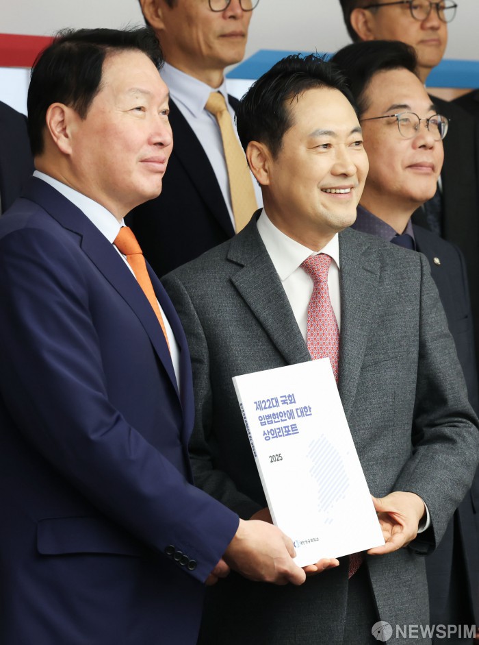 [서울=뉴스핌] 류기찬 기자 = 최태원 대한상공회의소 회장이 19일 오전 서울 중구 대한상공회의소 챔버라운지에서 열린 ‘국민의힘-대한상공회의소 정책간담회’에서 장동혁 국민의힘 대표에게 정책제안서를 전달하고 있다. 2025.11.19 ryuchan0925@newspim.com