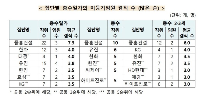 기업 집단별로 보면 중흥건설이 총수일가 1인당 평균 7.3개로 미등기임원 겸직 수가 가장 많았다. 이어 한화와 태광이 각각 4개, 유진이 3.8개, 한진·효성·KG가 각각 3.5개 순이었다.