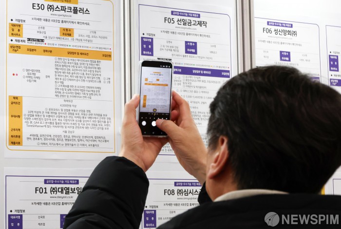 [대전=뉴스핌] 최지환 기자 = 19일 대전 유성구 컨벤션센터에서 열린 2025 KB굿잡 대전 일자리 페스티벌에서 구직자들이 채용공고를 살펴보고 있다. 2025.11.19 choipix16@newspim.com