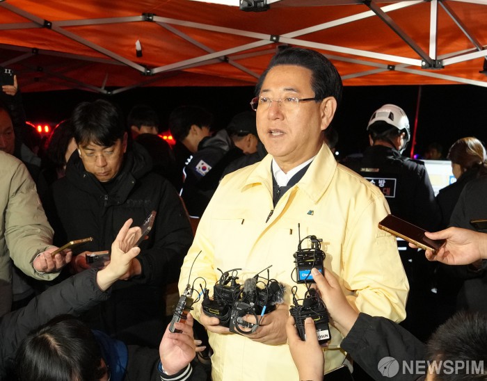 [신안=뉴스핌] 조은정 기자 = 20일 오전 전남 목포시 목포해양경찰서 전용 부두에서 김영록 전남지사가 여객선 퀸제누비아2호 좌초 사고와 관련한 브리핑을 하고 있다. 260여 명이 탑승한 2만6546t급 여객선 퀸제누비아2호는 19일 오후 8시 17분쯤 전남 신안군 장산도 남방 족도에 좌초됐다. [사진=전남도] 2025.11.20 ej7648@newspim.com