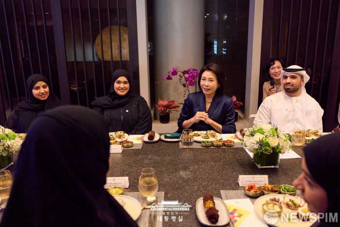 [서울=뉴스핌] 아랍에미리트를 국빈 방문 중인 이재명 대통령의 부인 김혜경 여사가 지난 18일(현지시간) 아부다비의 한 한식당에서 UAE 소재 대학 한류 동호회 회원들을 만나 오찬 간담회를 하고 있다. [사진=대통령실] 2025.11.20 photo@newspim.com