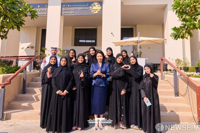 [서울=뉴스핌] 아랍에미리트를 국빈 방문 중인 이재명 대통령의 부인 김혜경 여사가 지난 18일(현지시간) 아부다비에서 UAE 소재 대학 한류 동호회 회원들을 만나 기념촬영을 하고 있다. [사진=대통령실] 2025.11.20 photo@newspim.com
